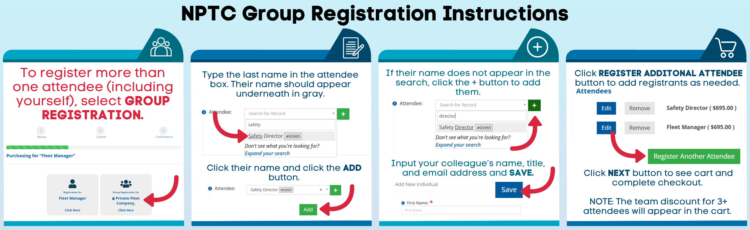 - Refunds are not available for paid attendee registrations when your company has complimentary registrations available to assign due to exhibit or sponsorship investment. NPTC recommends assigning any and all complimentary registrations your company is allotted BEFORE submitting paid attendee registrations. Please contact info@nptc.org with any questions.